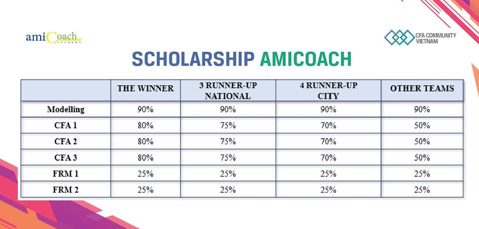 Cùng đồng hành với cuộc thi #CFA_Institute_Research_Challenge nhiều năm qua, Học Viện AmiCoach luôn mang đến cho các đội thi nhiều suất học bổng có giá trị, nhằm hỗ trợ các bạn sinh viên theo đuổi sự nghiệp tài chính của mình.