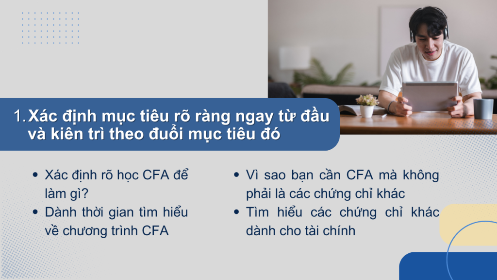 Tất cả số liệu thống kê mà mình nêu ra ở trên nhằm mục đích giúp cho bạn hiểu rằng công sức để theo đuổi CFA charter là rất rất rất nhiều nên ngay từ trước khi bắt đầu, bạn cần xác định rõ ràng mục tiêu bạn học CFA để làm gì và vì sao bạn cần CFA mà không phải là các chứng chỉ khác. Việc xác định rõ mục tiêu là rất quan trọng vì đó là động lực để thúc đẩy bạn kiên trì theo đuổi mục tiêu trong suốt quá trình học. Có như vậy bạn sẽ tránh bỏ ngang gây là lãng phí không đáng có.